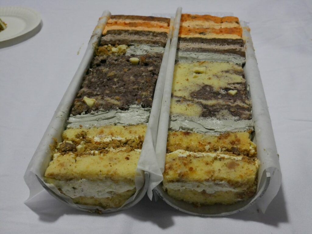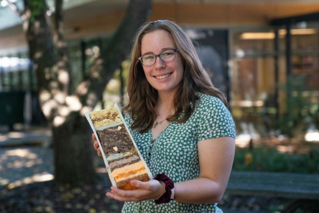 Recently, one of my PhD students, Alysha Jones, came up with a new way of displaying drill cores—by baking a cake. Yes, I know, it sounds a bit whacky, but… Each year at ANU there is a competition called ‘Bake Your PhD’ in which PhD, Masters and Honours students are invited to represent their research area with a cake. The entries are judged by look and taste, and this year Alysha won with a long layer cake inspired by the layered sediment cores she is studying from Lake George. The judging panel was headed by ANU Vice Chancellor, Brian Schmidt, and the winner’s prize was an inscribed cake stand.