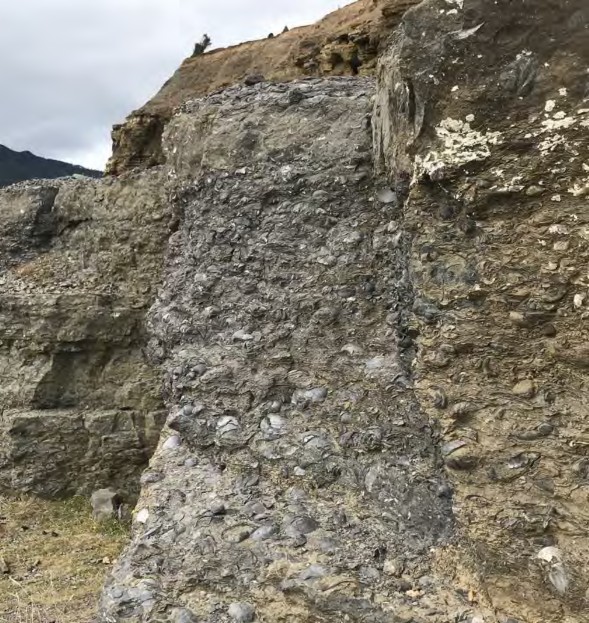 The Gondwanan continents shared not only ice sheets but also the cold-water fossil Eurydesma, a big, thick shelled bivalve that has been recorded in Permian glacial deposits from Australia, India, South Africa and South America (Runnegar, 1979). One of the most spectacular outcrops of these fossils is to be found on Maria Island, Tasmania. Here the shells of Eurydesma, spiriferid brachiopods and other marine invertebrates are so densely packed that they were once mined for cement. Among the shells are occasional cobbles of granite and other rocks. The shells beds are interpreted as subtidal shell banks that accumulated during a waning phase of the Permian glaciation, when there was still occasional sea ice (Fielding et al, 2010; Isbell et al, 2013). This world-class fossil site is now within the Maria Island National Park and can be accessed on a walking trail, please see the website for details https://parks.tas.gov.au/explore-our-parks/maria-island-national-park/fossil-cliffs.