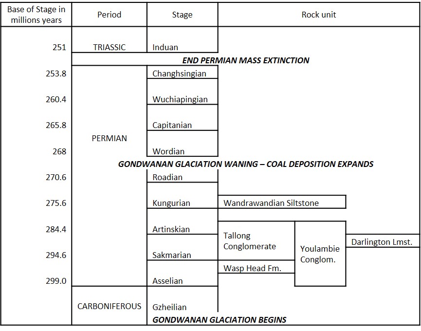 In Queensland, Late Carboniferous to Early Permian glacial sediments are recognised in the Bowen and Galilee basins, and in the Yarrol Block of the New England Fold Belt where the polymictic Youlambie Conglomerate outcrops. This conglomerate was deposited in the Early Permian (Asselian to Sakmarian) as a glacier advanced into a lake system (Jones & Fielding, 2004).