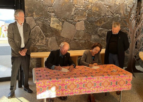 Brad Pillans (left) and Scott Saddler (right) watch as Mike Smith (second from left) and Christine Callen (second from right) sign as witnesses to the agreement between the NRG and the National Arboretum Canberra. Image courtesy M. Cooper.