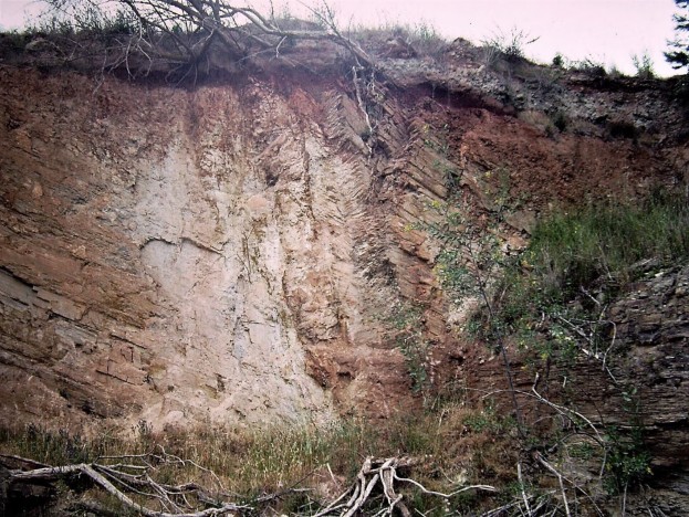 Sand dykes varying in width from a few centimetres to nearly one metre have been observed in some of the quarry workings, as well in other outcrops of the Mintaro Shale in the Mid-North. These originated as deep, open fissures that developed once the siltstone was consolidated, though not necessarily as highly lithified as it is now. Sand probably flowed into these fissures from above when sand was carried out into the basin by marine currents after silt deposition finished and the fissures opened. Alternatively, fluidised sand could have been injected from below. Either way, the sand sources are enigmatic as the closest sandstone units occur hundreds of metres above and below the Mintaro Shale.