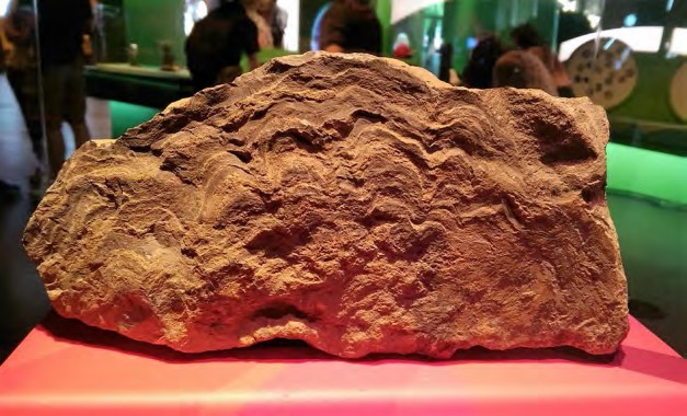 The adjacent text states ‘Stromatolites are columns formed by the building of calcium carbonate deposited by bacterial colonies. These bacteria began developing about 3.5 billion years ago. The colonies they formed dominated our planet for nearly 3 billion years, and gradually altered the chemical composition of the atmosphere by producing oxygen’. [Recently published research, by an Australian-led research team has identified stromatolites in 3.7 billion year-old rocks in Greenland.]