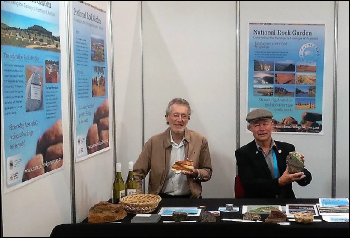 The NRG Steering Committee promoted the National Rock Garden at the Exhibition accompanying the Australian Geoscience Council Convention held in Adelaide in October last year. The figure on the right shows Brad Pillans and Mike Smith, NRG Directors, in the NRG Booth. Brad is holding a rather remarkable specimen of a rock known as Mookaite, which we offered as a prize for dropping a business card into a collection bowl.
