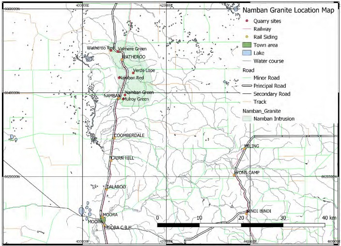 Six quarries have been opened up in the Namban Granite, and all have been described in the Geological Survey of Western Australia Mineral Resources Bulletin 24 on Dimension Stones of the Southern, Central Western, and Northern Regions by J.M. Fetherston. The location of these quarries is shown on the location map. The name of the quarries comes from the visual character of the rocks; Mulroy Green is the name of a dimension stone from the Donegal granite in Ireland, which may be the origin of the name. Valmere Green is the colour of green dinnerware prized in the 1950’s.