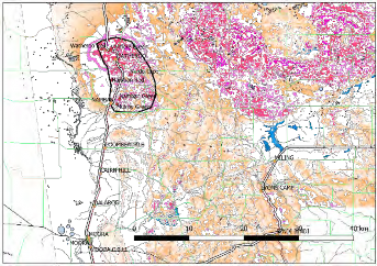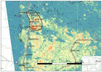 Rock types like those of the Namban intrusion are unusually low in quartz and high in potassium compared to most granites intrusions. They form distinctive patterns in geophysical data, with high potassium and commonly (but not always) a strong magnetic signature. The Namban intrusion can be mapped readily in areas that are underlain by the granite, but where no outcrop can be seen, from the radiometric signature of overlying soils. This is measuring the elevated potassium, which is the main component of the large pink- coloured crystals in the outcropping rocks.