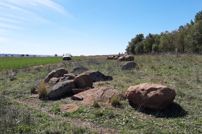 The aim of this recent field trip was to meet with the property owners who had previously agreed to donate a large boulder from their land to the National Rock Garden. Our task was to measure the physical dimensions of a range of diorite boulders and to calculate their probable weight using the density of 2.79 gm/cc provided by GA staff for this rock. Numerous large boulders had been uplifted from the farm paddocks and pushed to the edges of the fields, making our job relatively easy.