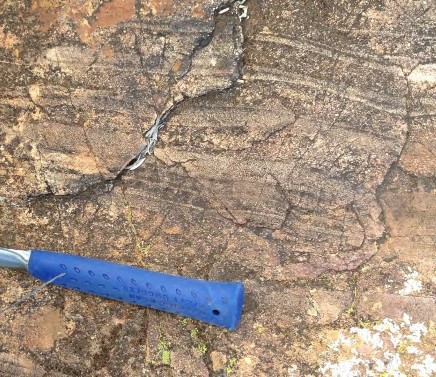 The rock of the month is a plagioclase-quartz-pyrite gneiss unit of the Himalaya Formation, Thackaringa Group, located about 25km SW of Broken Hill In western NSW. The age of the rock unit is 1,699 ± 10 million years (Statherian Period, Paleoproterozoic Era). The rock is very unusual in that it is made up almost entirely of quartz, pyrite, and sodium-rich plagioclase feldspar (albite). It forms stratabound lenses, often several kilometres long and several tens of metres thick within the Thackaringa Group located stratigraphically below the Broken Hill Group which hosts the massive Broken Hill orebody.