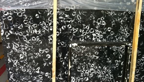 Most of the specimens in the slab represent slices through the ‘beak’ part of articulated shells, many still in growth position. Others show different sections of the shell—still the ‘beak’ area but sliced more obliquely so that a small part of the valves distal to the ‘beak’ are also shown (they look like spines). The shells were projecting at an angle from the sea-floor (hence the oblique sections) as the slab has been cut at an angle to bedding. Bits of sliced valve away from the thick beak region show as much thinner curved white lines (Henderson, 2012).