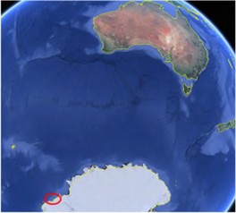 The location of Mawson Station (red circle) relative to the Australian mainland is shown in this image.