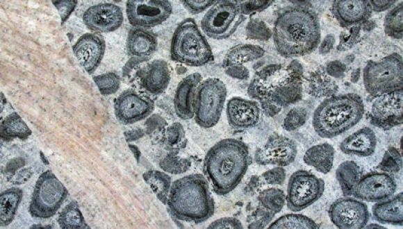 Within the sill-like structures, abundant granitic orbicules are contained in a leucogranitic body of variable tonalitic composition. The black and white, concentrically banded orbicules are of spectacular appearance. Orbicules are mostly ellipsoidal but also include lesser numbers of near-spherical, irregular and broken shapes. Orbicules have an average length of about 140 mm along their longest axis by 75 mm in width. Orbicule spacing varies from orbicular masses in tangential contact with one another to a maximum separation of about 100 mm, although overall orbicule distribution appears roughly uniform throughout the rock, as shown in the photograph of the matrix cut by a pegmatite vein accompanying this article.